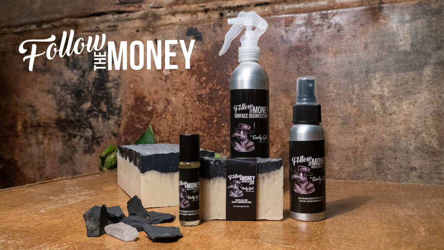 Our Follow the money products are created using a five oil blend known as "Thieves" oil which date back to the 1400's. These oils are cinnamon,clove,lemon,